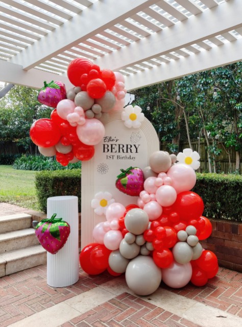 This vibrant balloon installation draws inspiration from strawberry-themed celebrations, combining bold colours with playful decorative elements to create a cheerful and engaging setup.