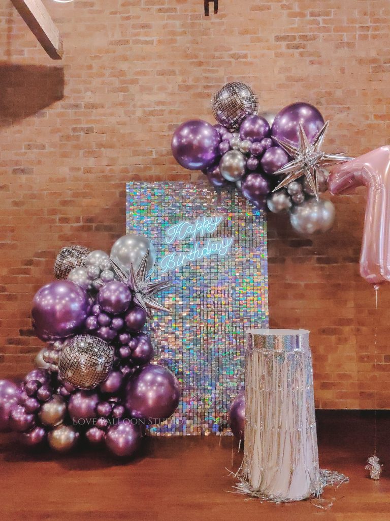 Deep purple balloons bring richness and drama, while metallic silver tones add a polished, mirror-like shine that feels sleek and sophisticated.