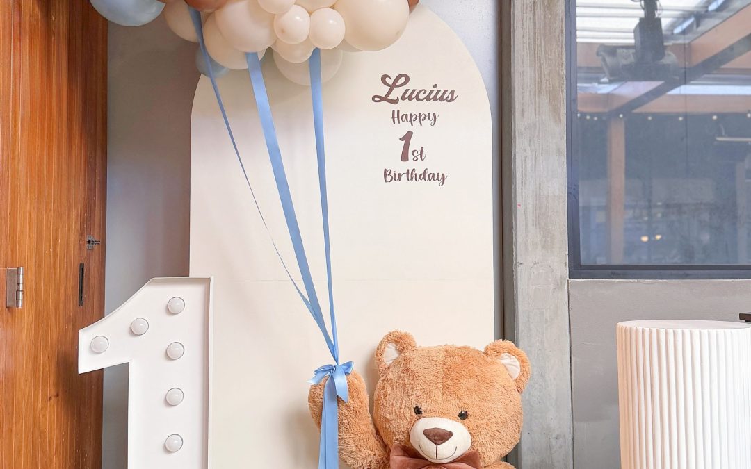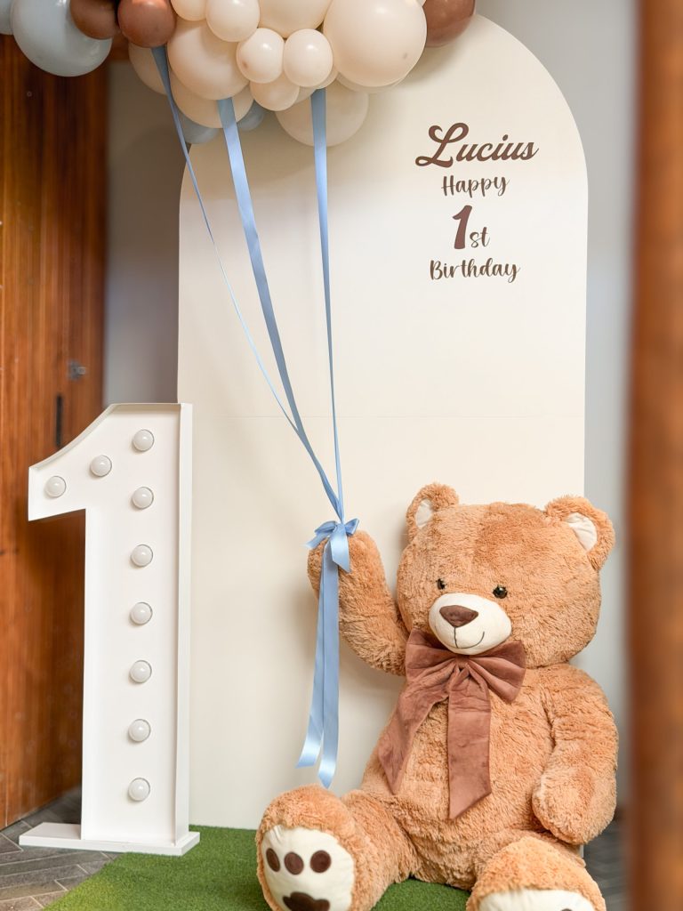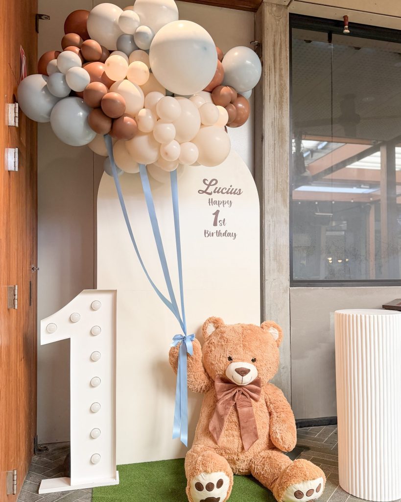 A plush teddy bear placed at the base adds warmth and charm to the setup, making the scene feel inviting and playful. Together with the illuminated number décor and soft balloon textures, the entire installation creates a welcoming focal point perfect for a memorable celebration.