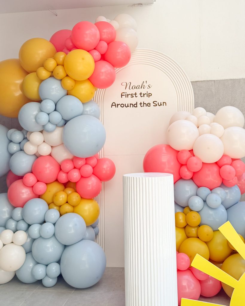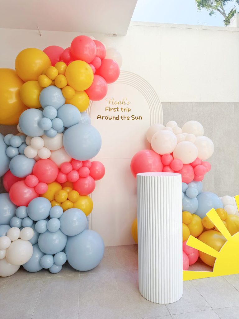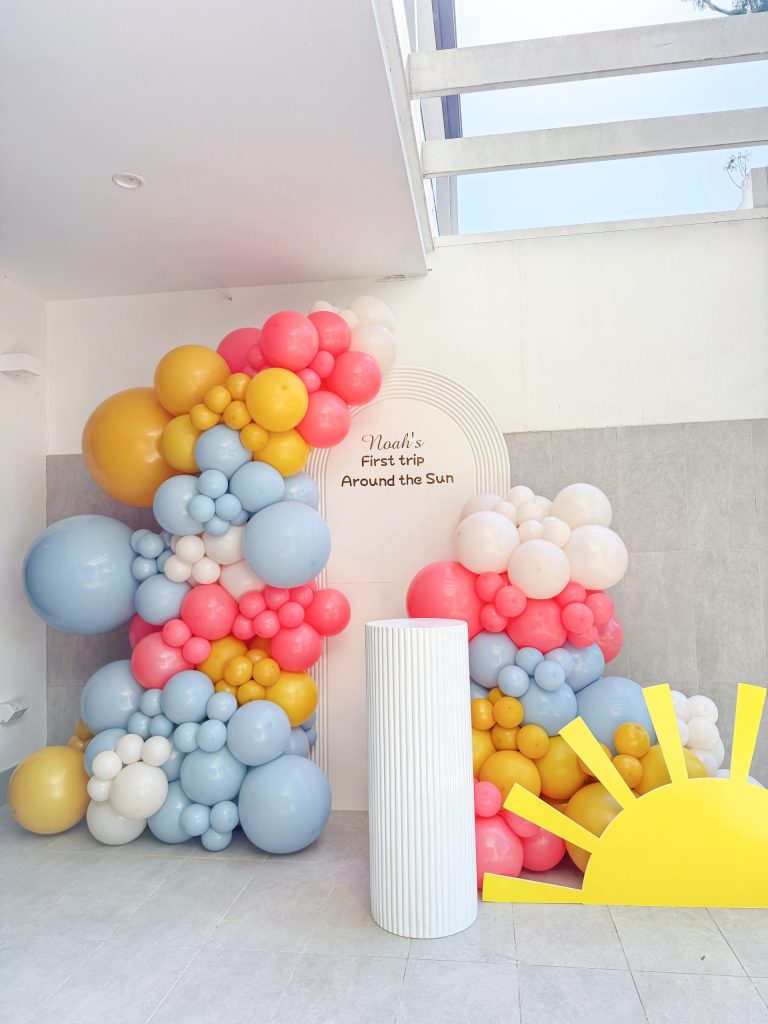 Adding a touch of whimsy and personality, a golden sun-shaped decorative piece sits gracefully at the base of the installation. It brings a warm and radiant accent that ties the entire concept together, echoing the brightness of the color palette and infusing the design with a joyful, youthful charm. This detail helps transform the display from simple decoration into a storytelling scene — one that evokes the feeling of sunny skies and carefree celebration.