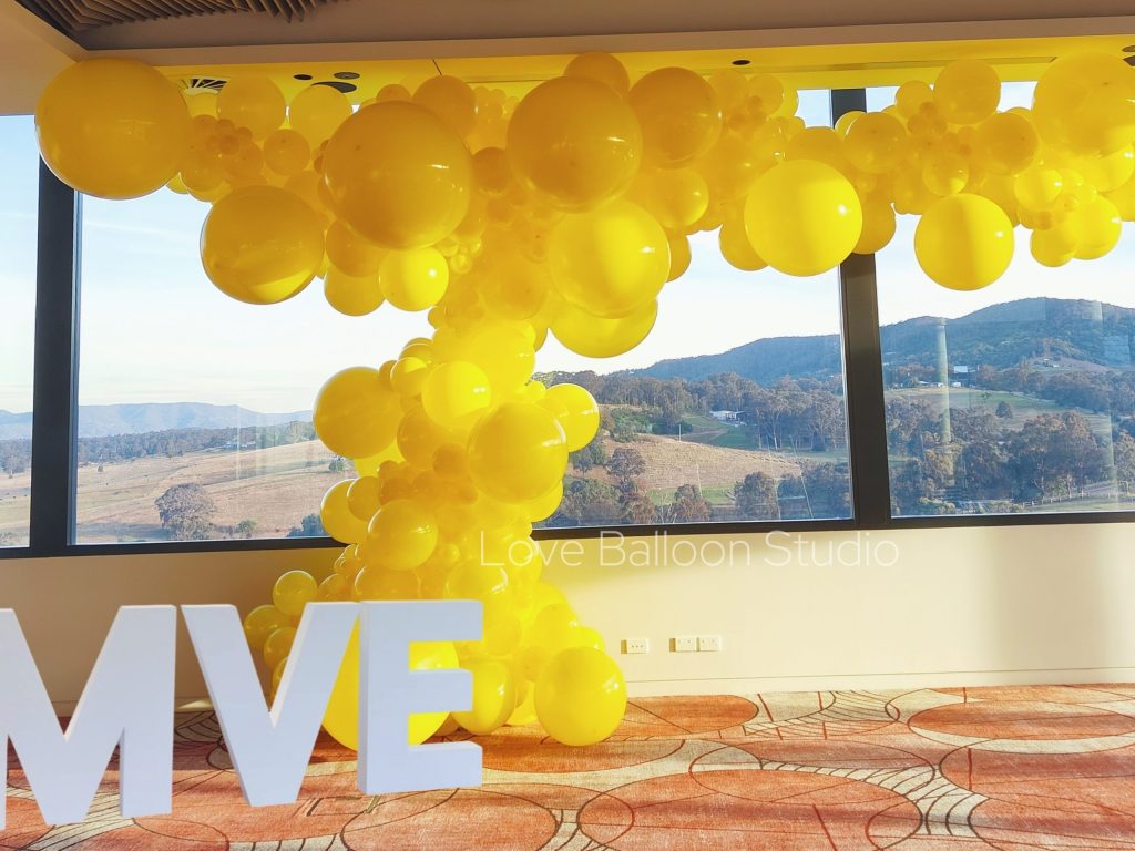 For Mountview Estate, our design team moved beyond traditional arches and garlands, choosing instead a free‑form sculptural installation. Built entirely from yellow balloons in varying sizes, the piece rose from the floor and flowed across the ceiling line, creating a dynamic column that echoed movement and light.