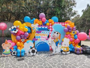 For this 100 days celebration, we designed a lively and colorful setup inspired by playful animals and sporty energy. The combination of bold balloon colors instantly creates a cheerful atmosphere, while the layered arrangement adds depth and a premium visual feel.