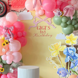 为了强化花园主题,我们融入了插画花卉和鲜花,营造出丰富的质感和层次感。透明气球的加入增添了一丝现代气息,而丝带蝴蝶结和花束等小细节则让整个布置显得精致考究,处处体现着精心策划。.