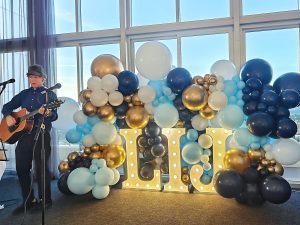 该设计以大型发光字母灯箱为核心,营造出强烈的视觉焦点。有机造型的气球花环围绕着字母灯箱,采用海军蓝、浅蓝、白色和金色气球,形成层次丰富的造型。.
