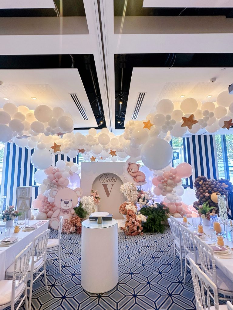 这场迎婴派对之所以如此令人难忘,在于它宁静而又充满欢乐的氛围。中性色调营造出轻盈雅致的氛围,而泰迪熊气球造型和星星装饰等趣味细节则增添了温馨的魅力。帕克维尤厅的大窗户引入充足的自然光线,衬托出桃色和白色的色调,让每一个细节都熠熠生辉。.