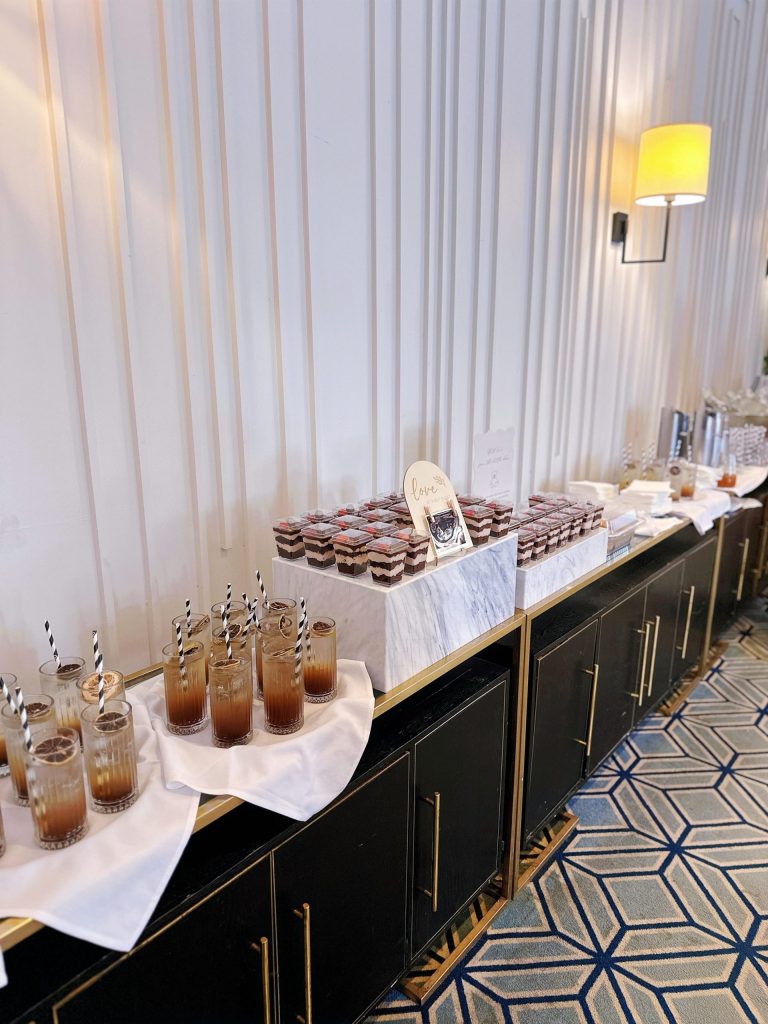 这 甜点和饮料站 另一个视觉亮点是:一个线条流畅的大理石台面,上面摆放着精致的迷你甜点和特色饮品。每杯饮品都盛放在晶莹剔透的玻璃杯中,配以条纹吸管,并以干柑橘片点缀,更添美感。这样的布置与整个空间的简约优雅风格相呼应,在奢华与简约之间取得了完美的平衡。.